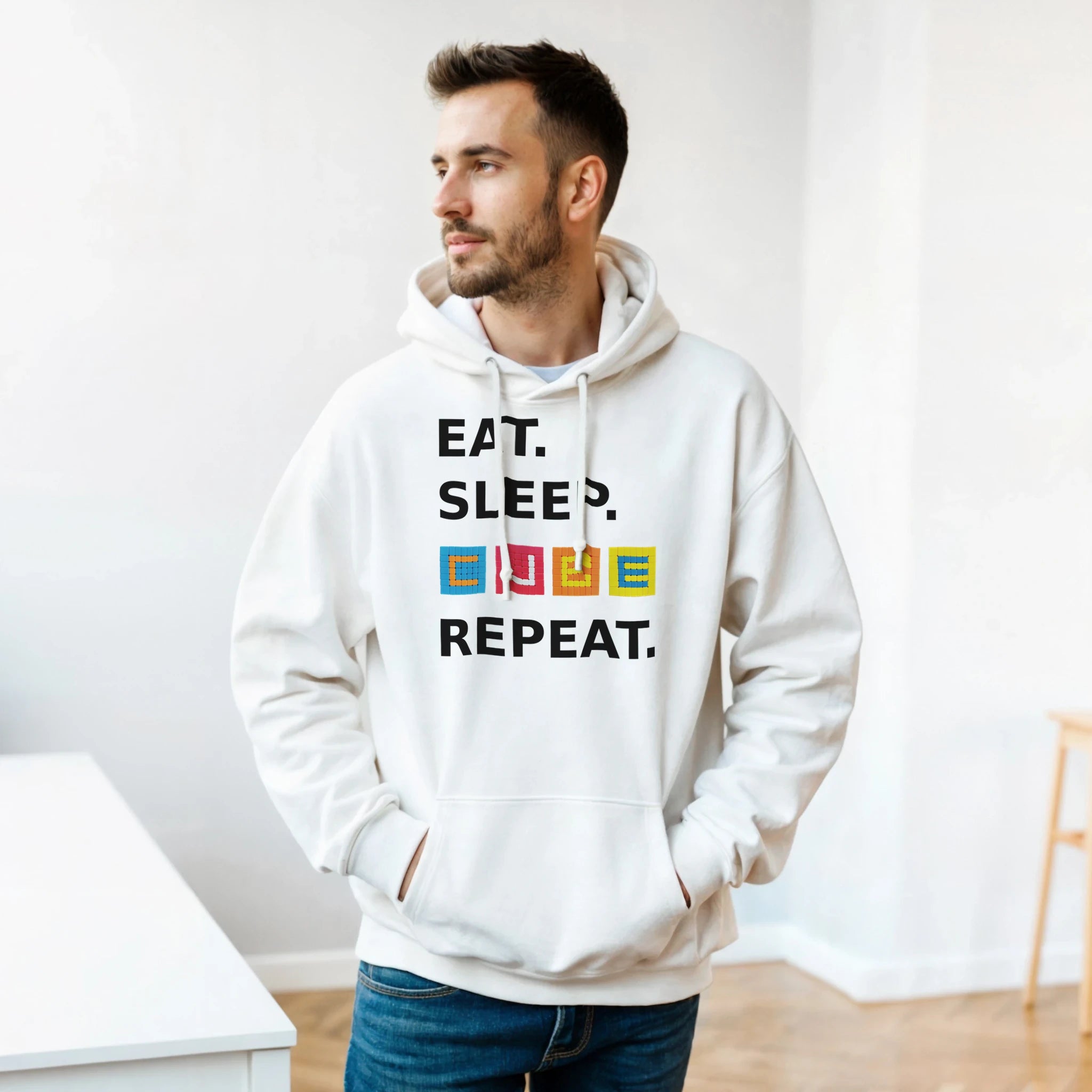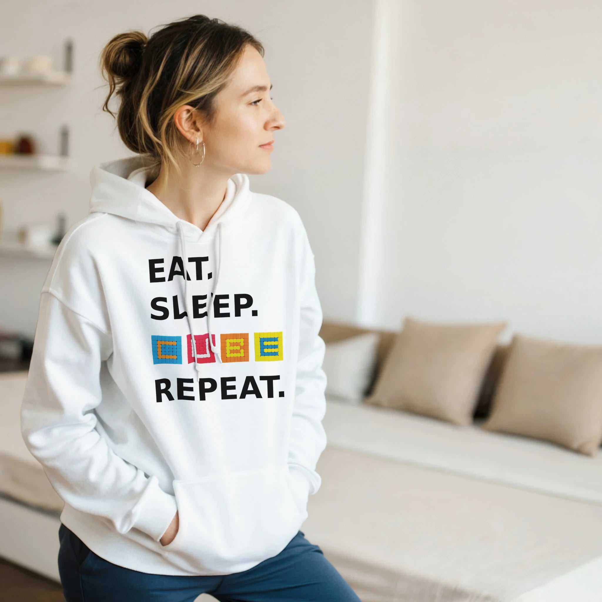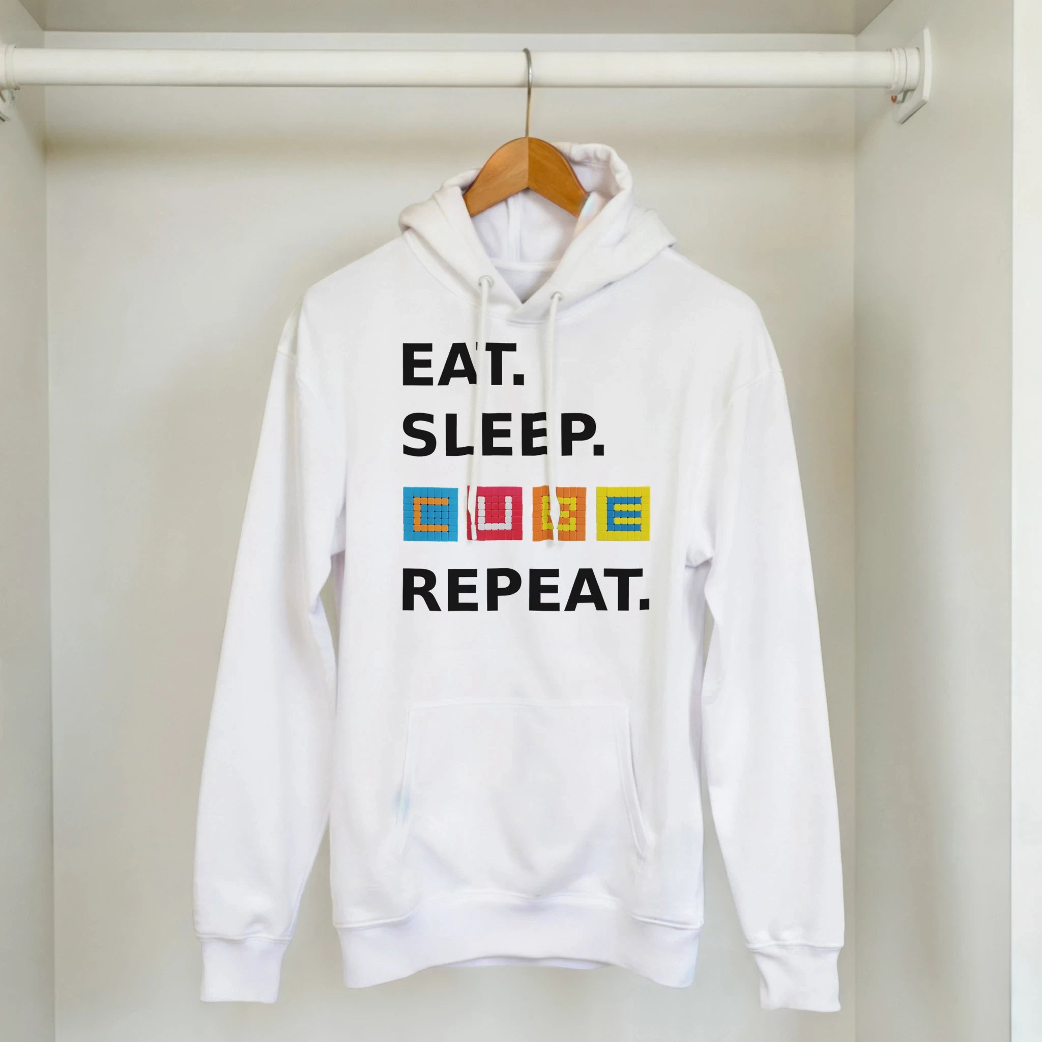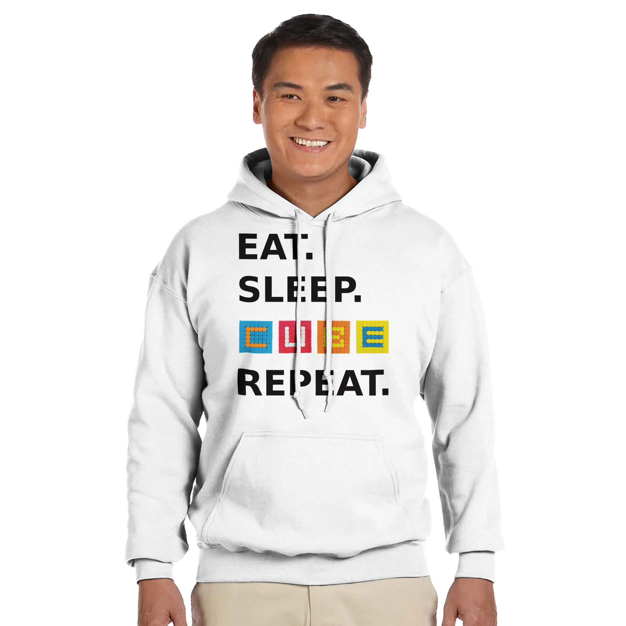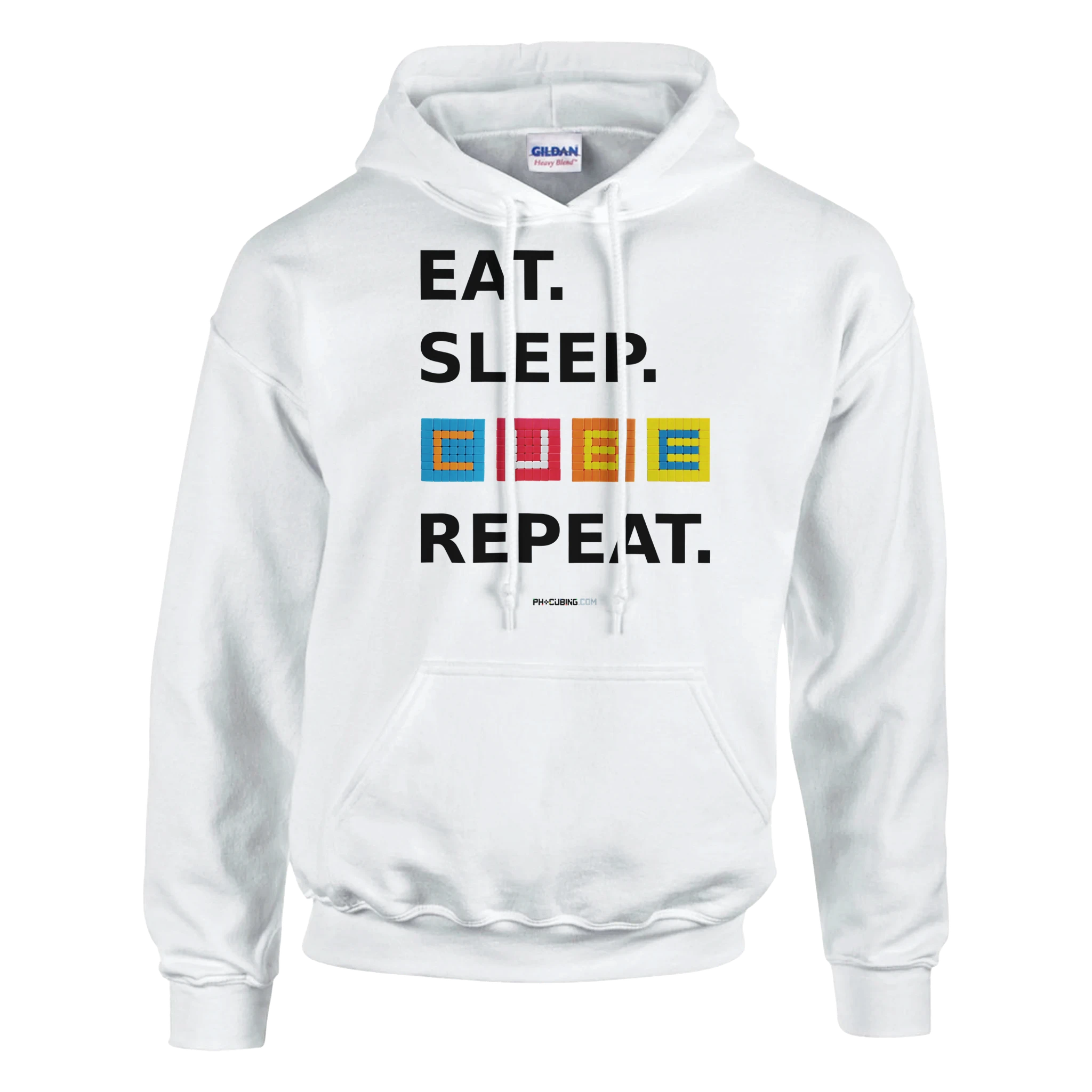 This is a cuddly heavy blend hoodie made of a soft blend of 50% cotton and 50% polyester. The front pouch pocket can store cubes, snacks, a phone, and more cubes.