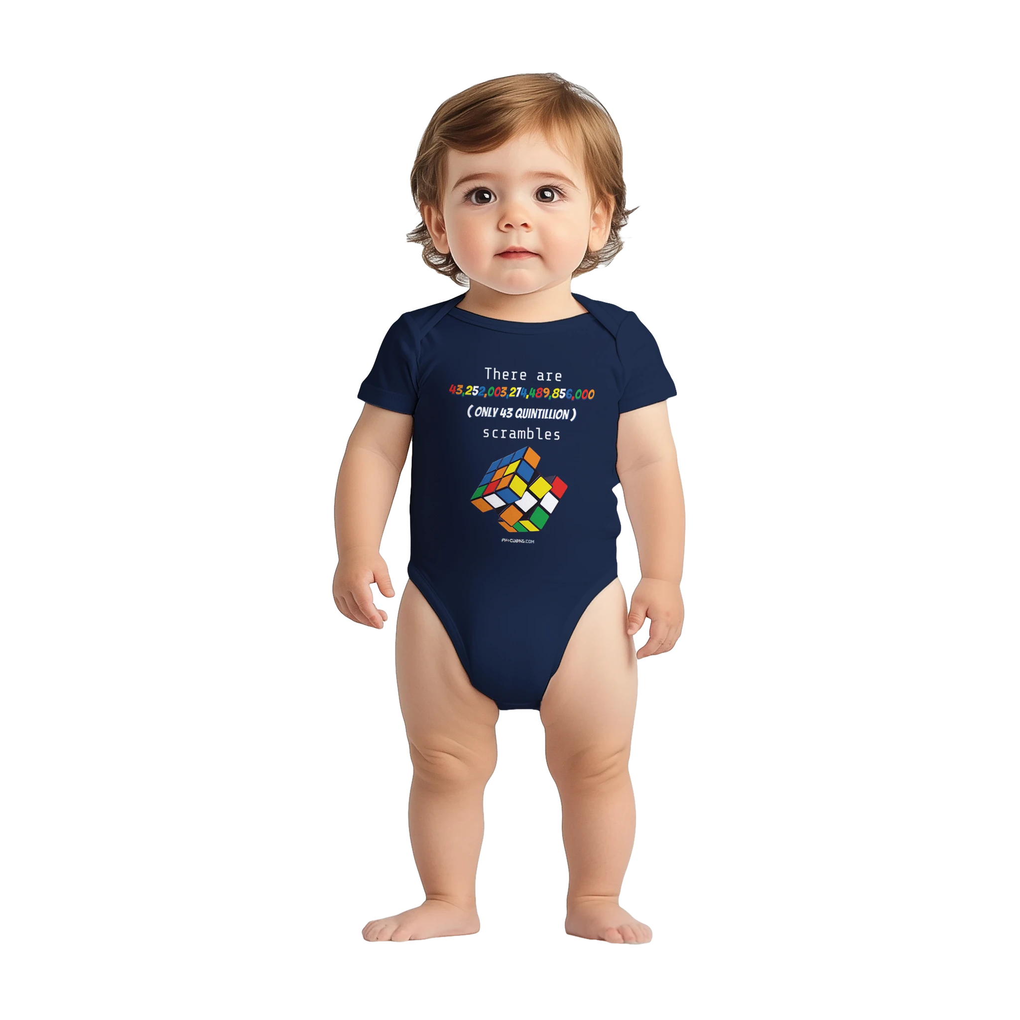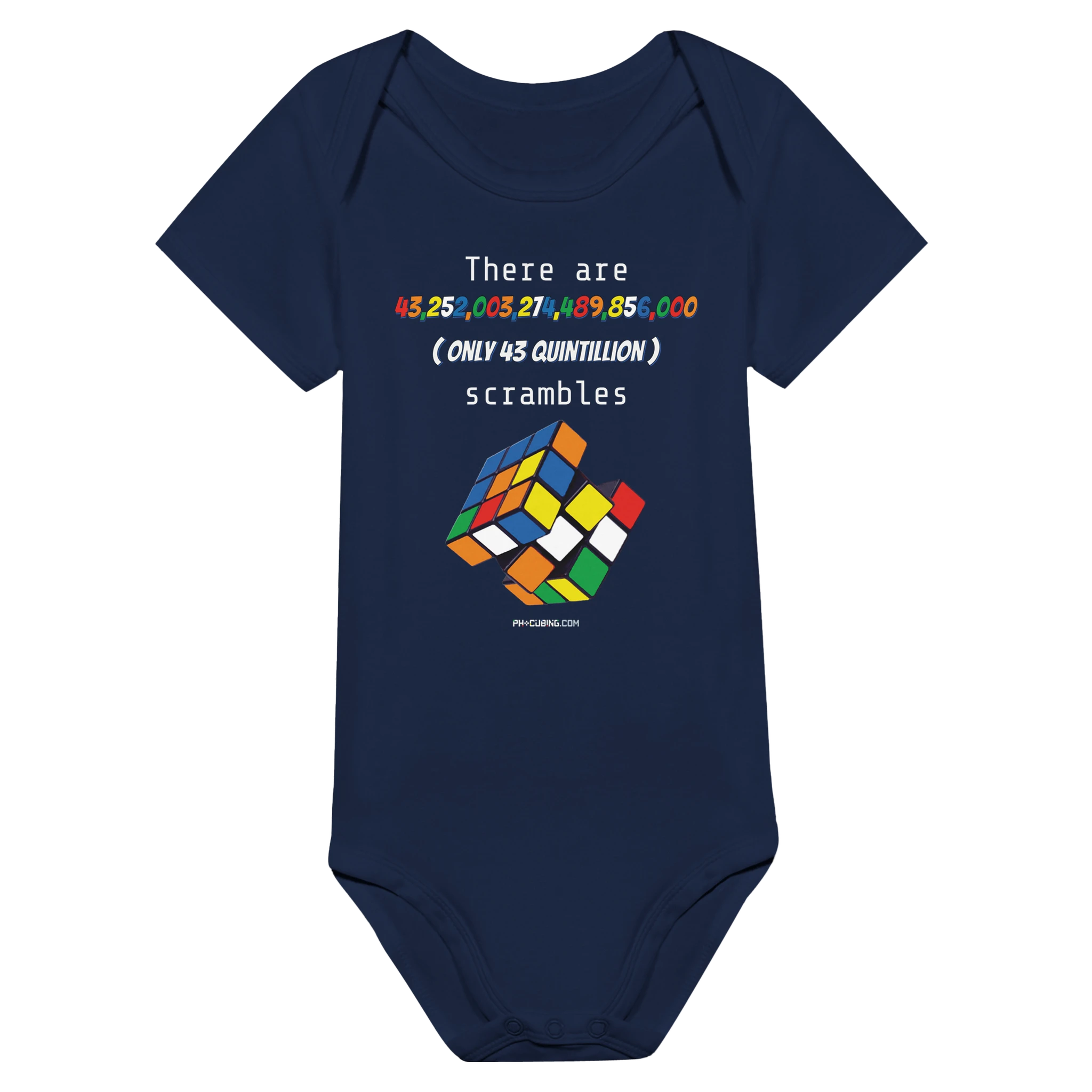 There are 43 quintillion possible scrambles, probably as many times as your baby screams in a day (or during the night). But seriously, props to those younger folks who can solve the 3x3 cube - in a few minutes - and extra props to those speedcubers who can take any of the 43 quintillion scrambles and solve it in mere seconds.